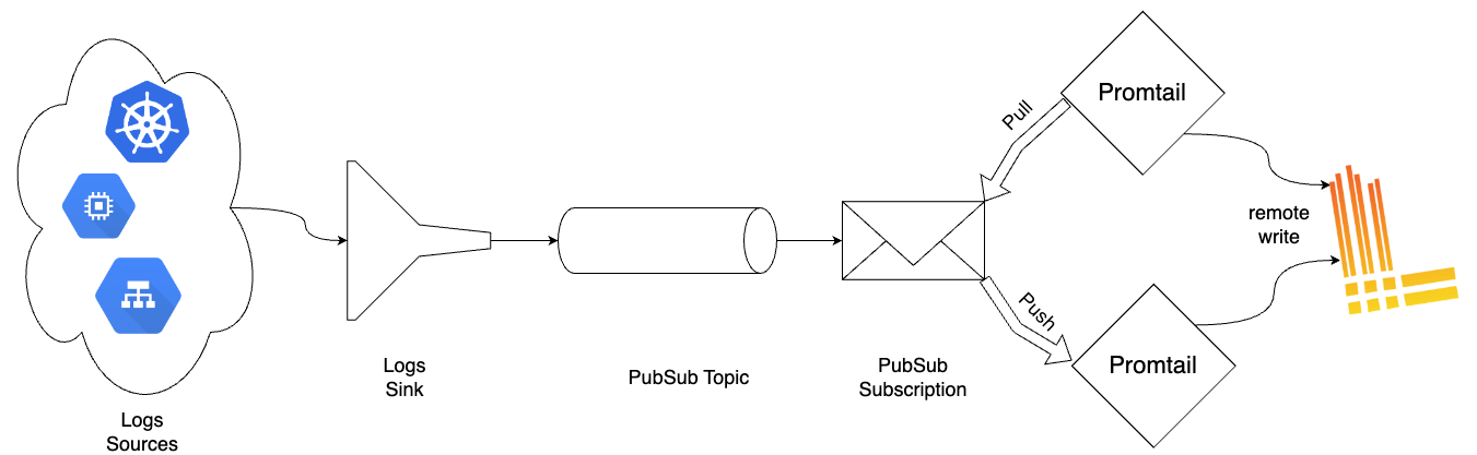 Overall, the setup between GCP, Promtail and Loki will look like the following: